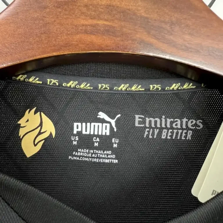 The AC Milan 125th Anniversary Black Jersey – Long Sleeve is a distinguished piece of football heritage, celebrating the club’s rich history since its founding in 1899. This retro kit features a sleek black design, offering a modern twist while honoring the Rossoneri’s storied past. The jersey showcases a vintage AC Milan crest on the chest, symbolizing the club’s enduring legacy. Crafted by Puma, the classic jersey incorporates advanced materials for optimal comfort and performance, including moisture-wicking technology to keep you dry during wear. A true vintage jersey, this classic kit is a must-have for fans of retro jerseys, encapsulating the essence of AC Milan’s 125-year