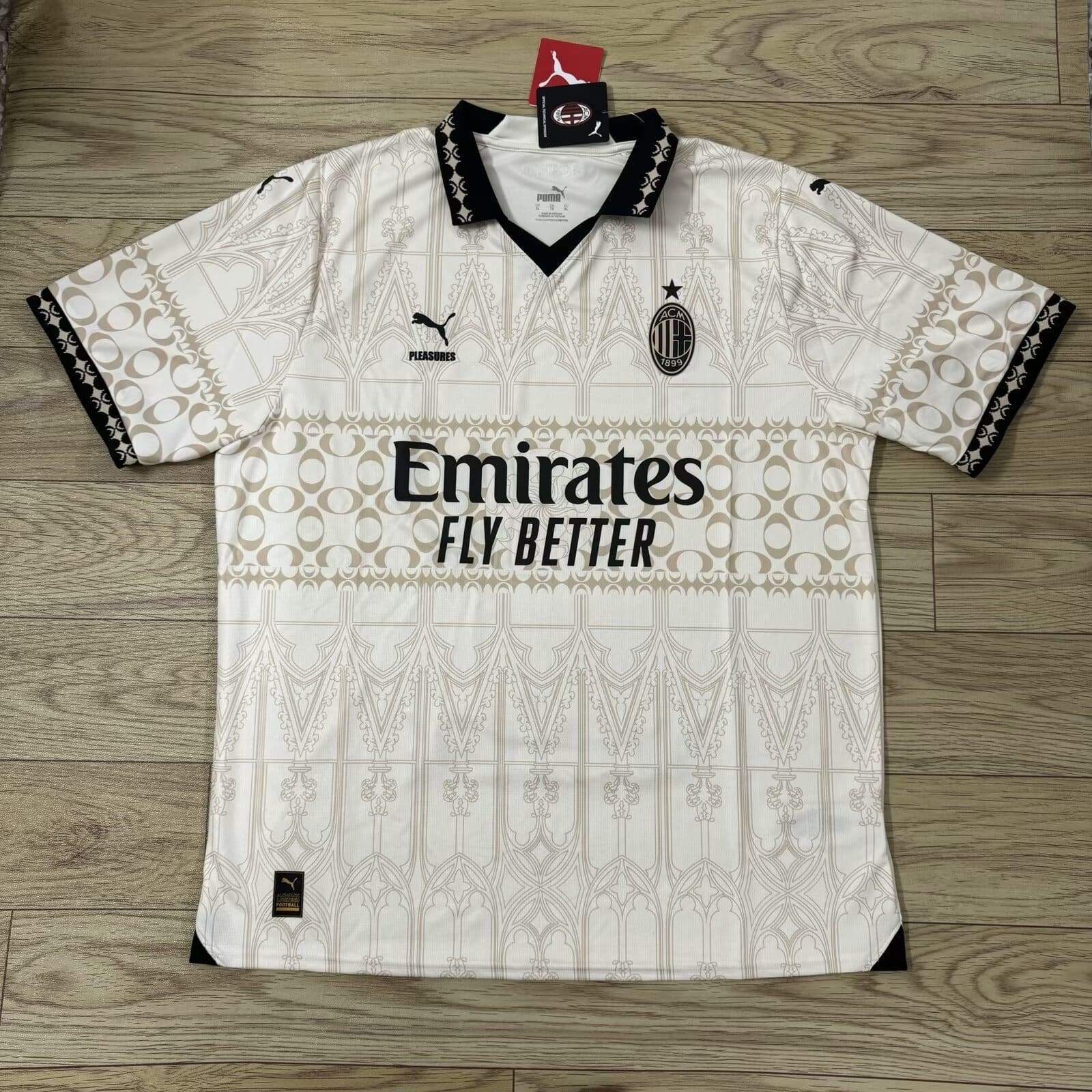 The AC Milan x Pleasures 23/24 4th White Kit – Fan Version is a stunning collaboration that blends football culture with contemporary fashion. With its clean and stylish design, this jersey embodies the fusion of sport and streetwear, capturing the essence of AC Milan’s iconic legacy.