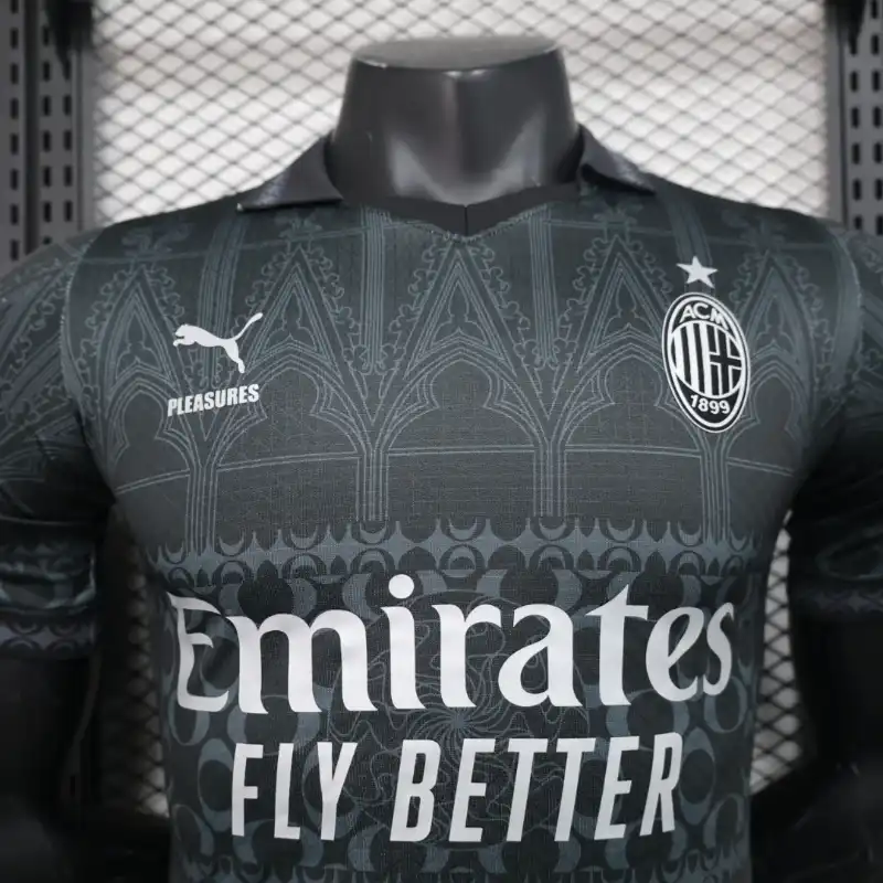 The AC Milan x Pleasures – player Version is a stunning collaboration that blends football culture with contemporary fashion. With its clean and stylish design, this jersey embodies the fusion of sport and streetwear, capturing the essence of AC Milan’s iconic legacy.