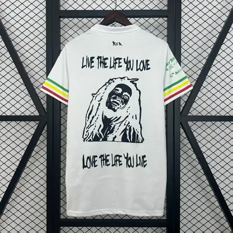 The Ajax Bob Marley Kit – Fan Version is a tribute to unity, freedom, and football culture. Inspired by the reggae legend and Ajax fans’ anthem “Three Little Birds,” this football jersey features a sleek black design with red, yellow, and green accents—a symbol of peace and pride.