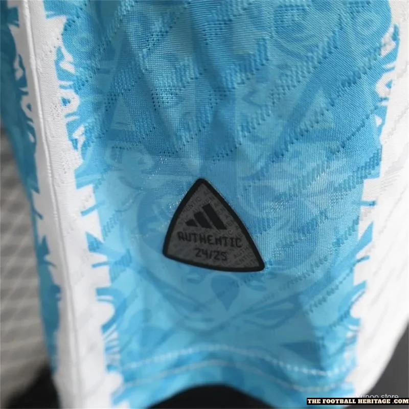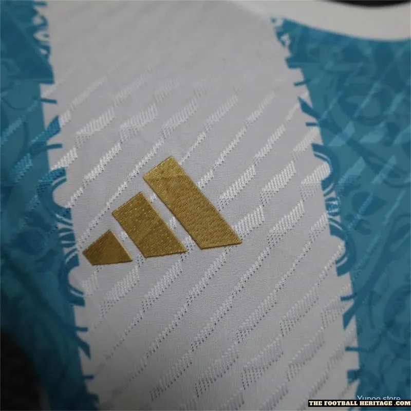 The design features a clean white base with elegant sky-blue patterns inspired by the AFA crest — a tribute to the legacy of La Albiceleste and the generations of stars who’ve worn the badge with honor. Engineered from premium, breathable materials, the Player Version ensures performance-level comfort, agility, and fit for players and passionate fans alike.