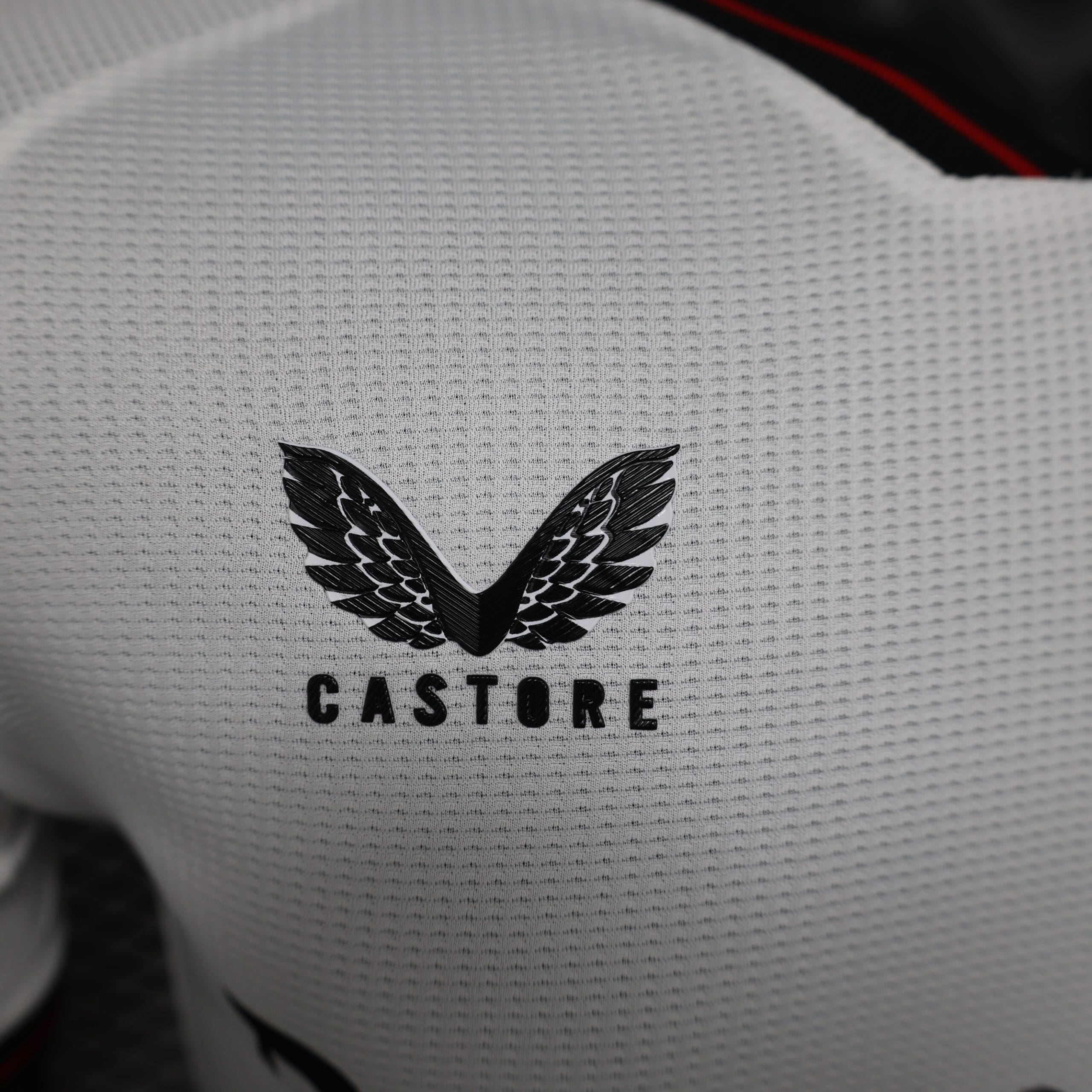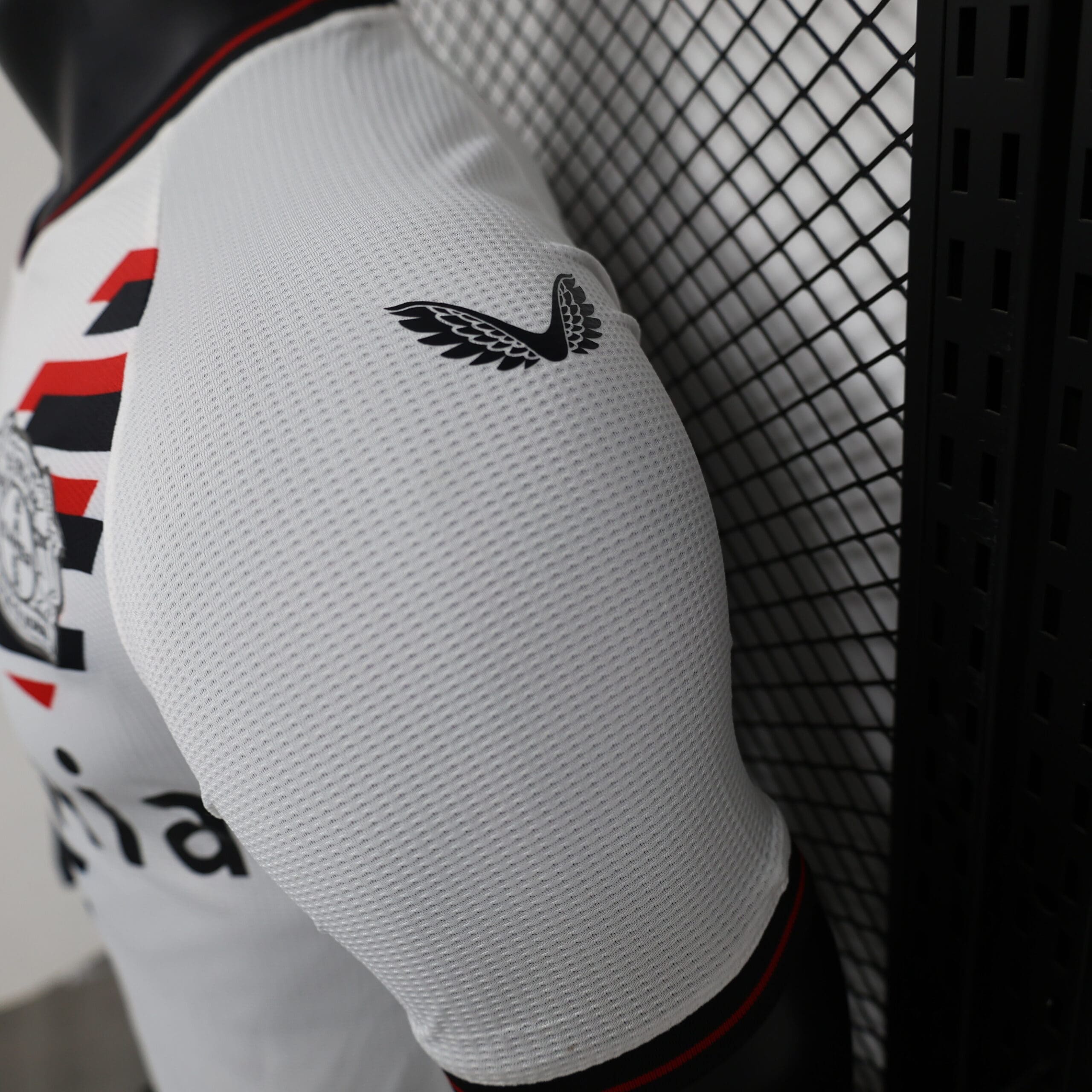 Inspired by vintage jerseys, the 23/24 away kit features a bold and elegant colorway, incorporating shades of white and black with subtle red accents, reflecting the club’s identity. The classic kit is enhanced by a refined collar and sleeve details, delivering a timeless look that resonates with both long-time supporters and new generations.