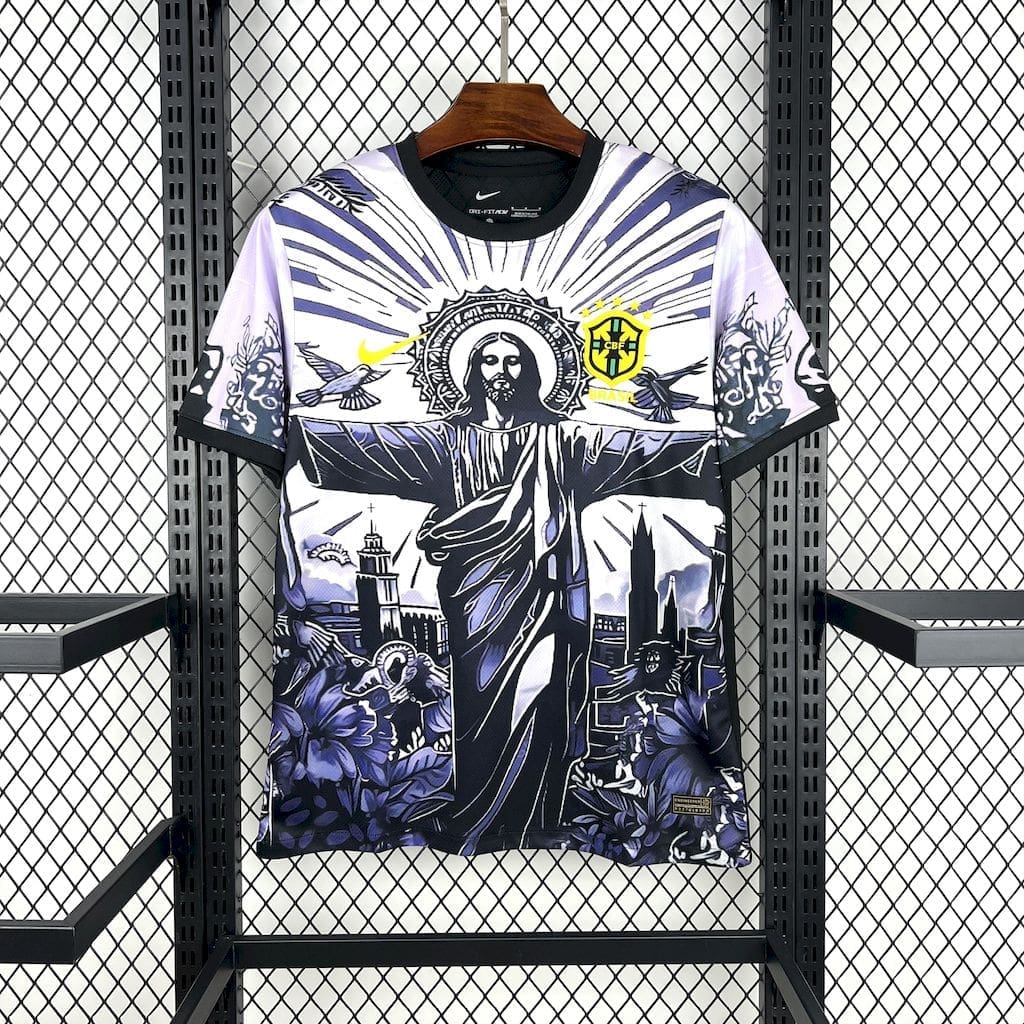 The Brazil Christ Purple Kit – Fan Version blends spiritual symbolism with iconic football heritage. Draped in royal purple and accented with subtle gold or white trims, this special edition jersey features a powerful illustration of Christ the Redeemer—celebrating faith, unity, and Brazil’s deep-rooted love for the beautiful game.