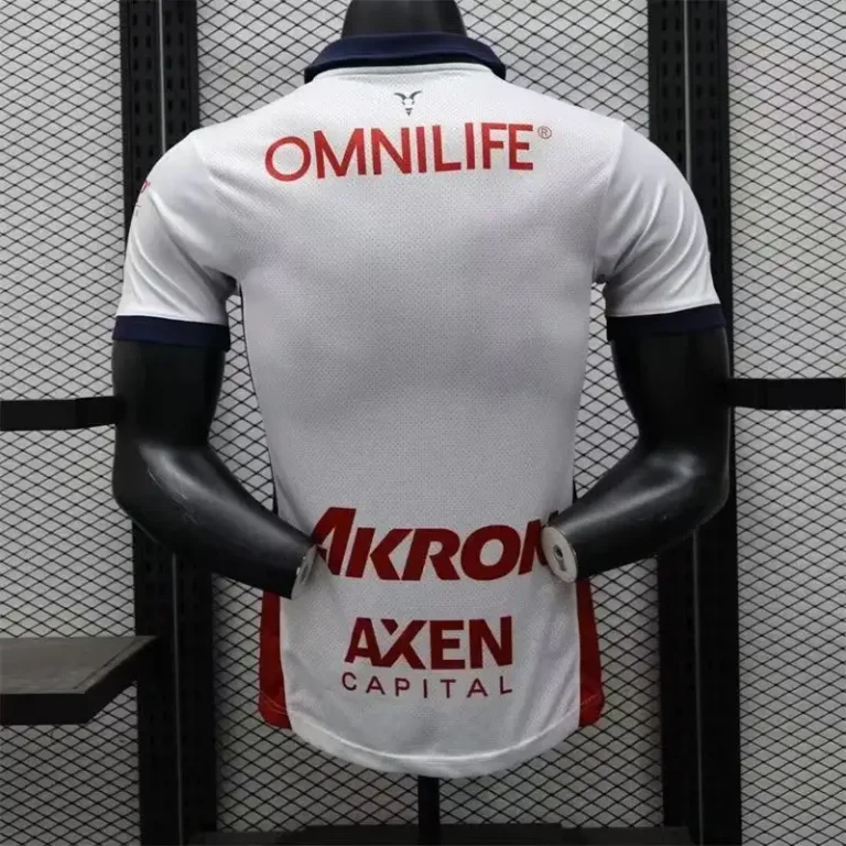 The Chivas Guadalajara 24/25 Away Kit – Player Version is a bold tribute to the club’s football heritage, blending tradition with contemporary design. Featuring a crisp white base adorned with striking red diagonal accents and navy blue details, this kit pays homage to the team’s iconic identity while embracing a modern aesthetic.