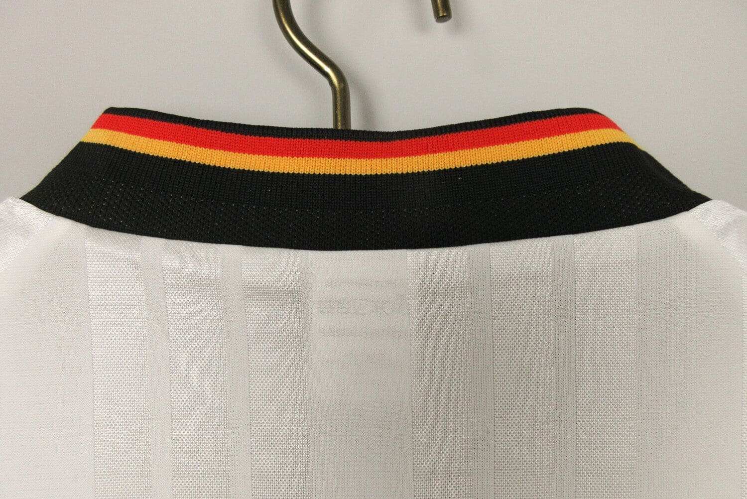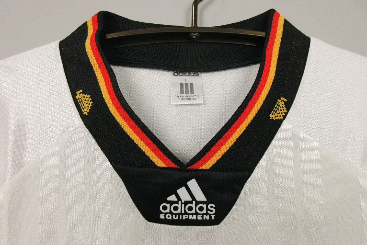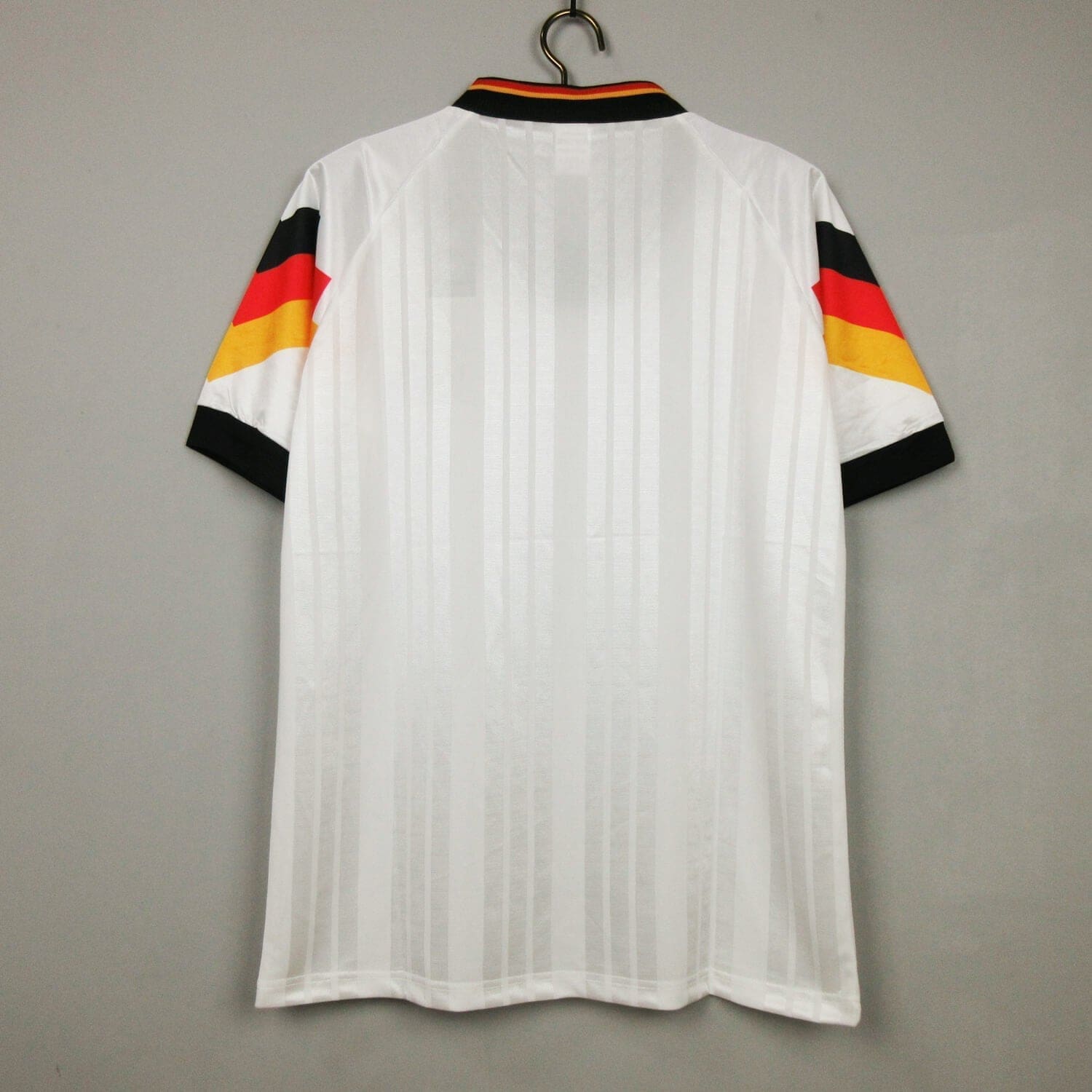 The Germany 1992 Home Kit features a classic design with a white base and black accents. The jersey has a black collar and cuffs, with the famous three stripes of in black on the shoulders. The German national team crest is proudly displayed on the left chest, with the logo on the right. This kit is considered a classic among football fans and is part of Germany’s football heritage. It is a retro kit that will always be remembered as one of the most iconic jerseys of the early 90s.