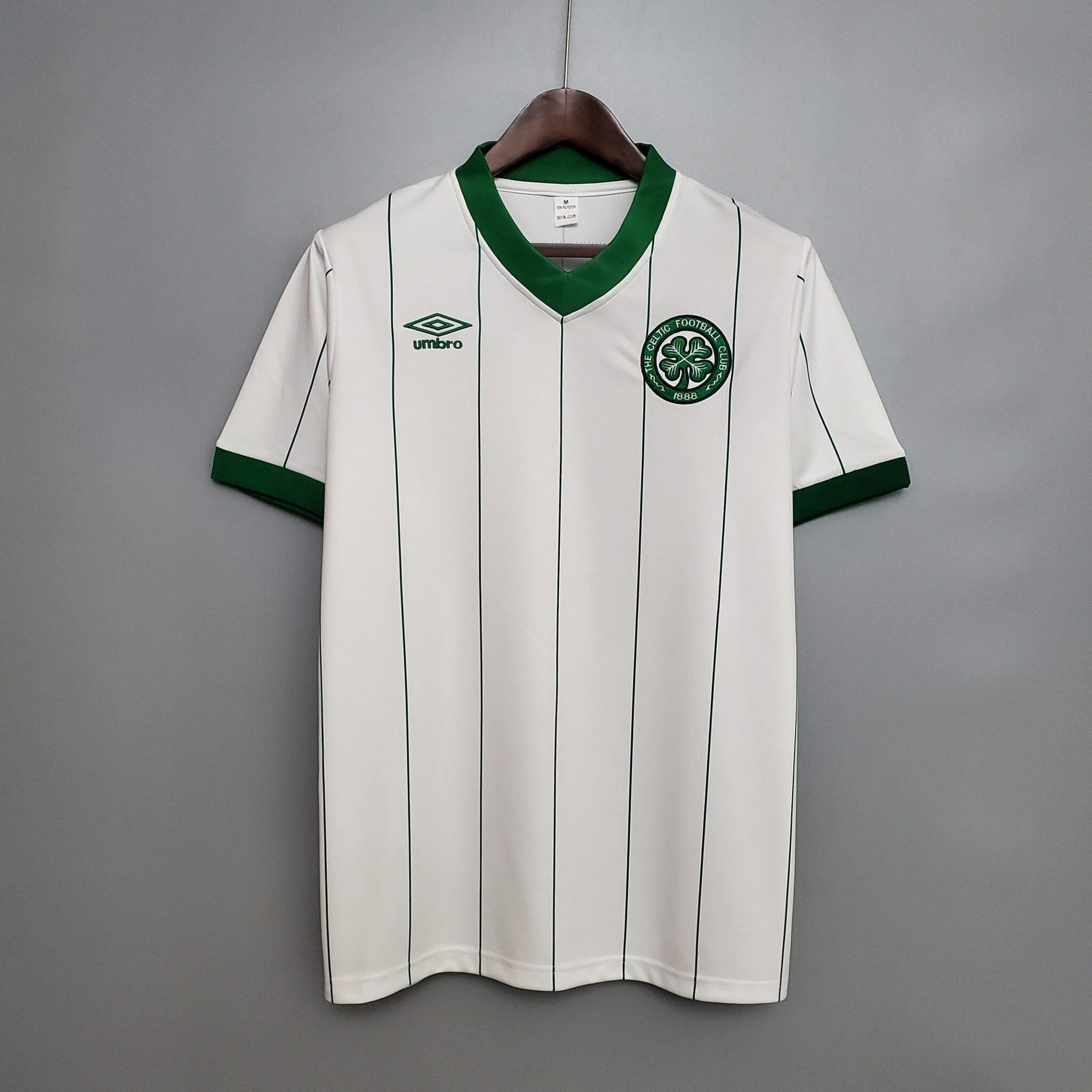 The Glasgow Celtic 1984/1986 Away Kit features a white shirt with green and yellow pinstripes, paired with green shorts and green and yellow hooped socks. The shirt also features a green and yellow v-neck collar and green cuffs. This classic kit is often associated with Celtic’s legendary player, Paul McStay, who wore it during his time with the club. It is a true representation of Celtic’s rich football heritage and is a beloved retro kit among fans of the club.