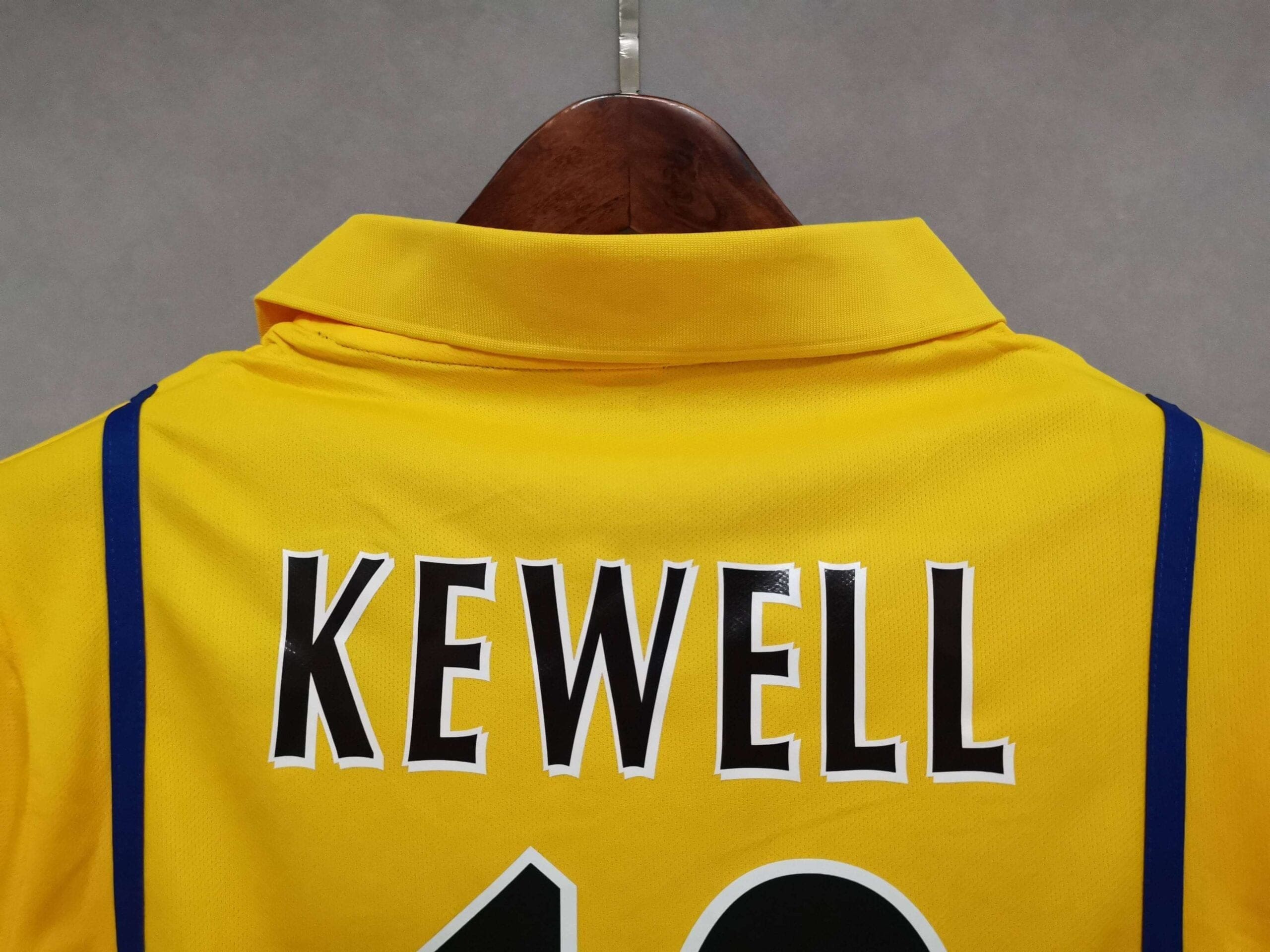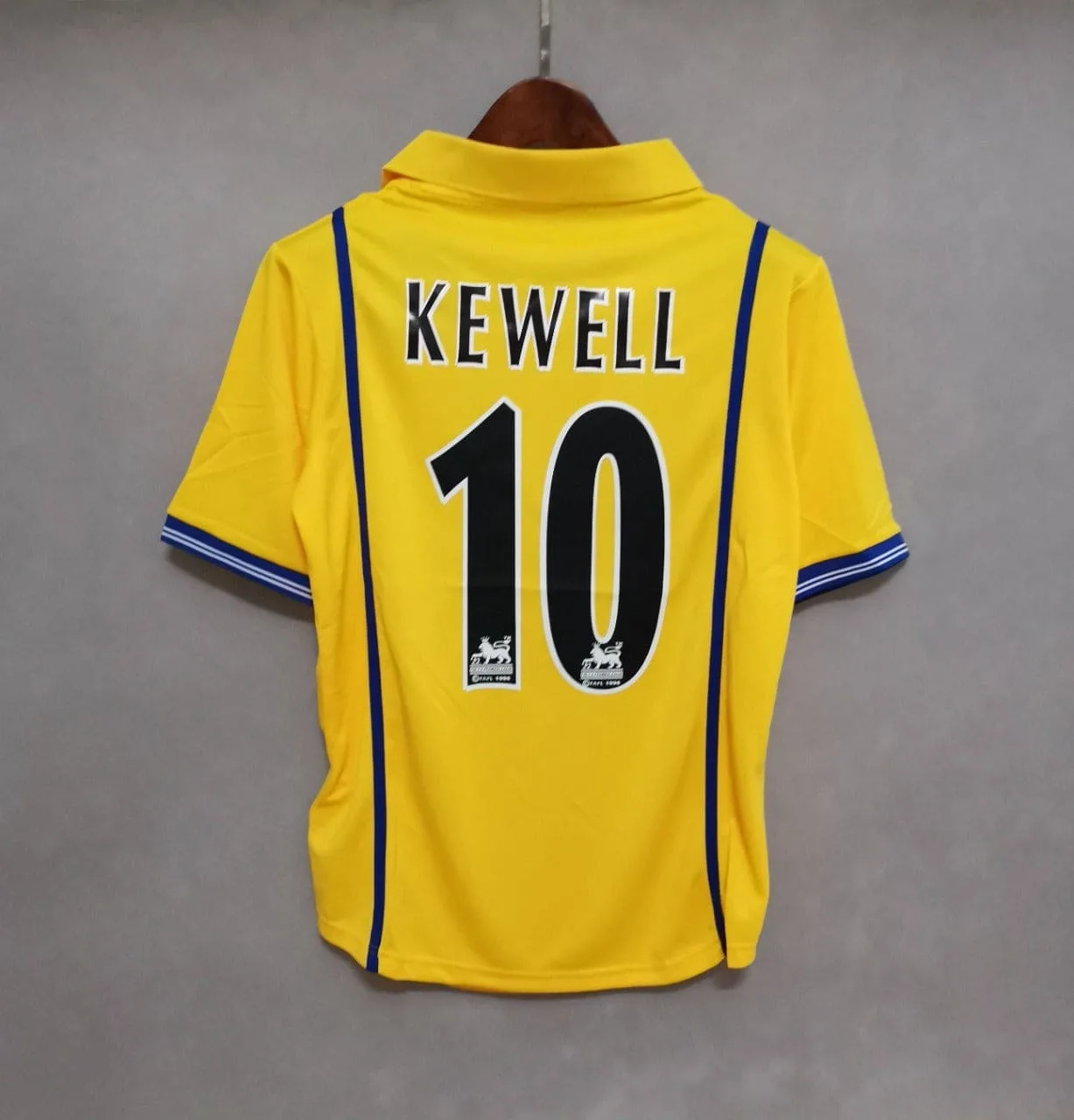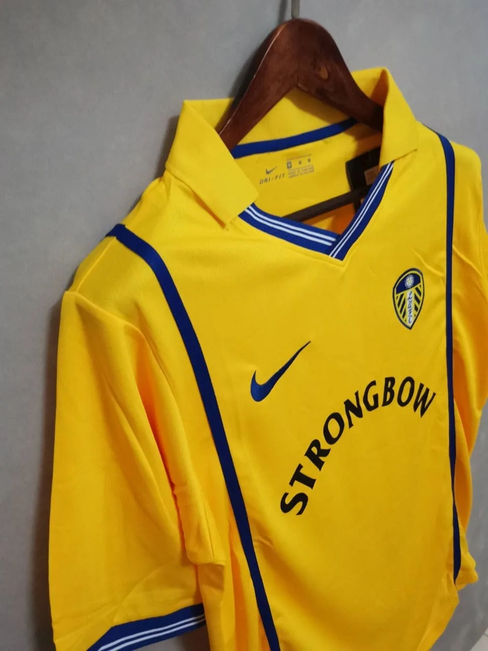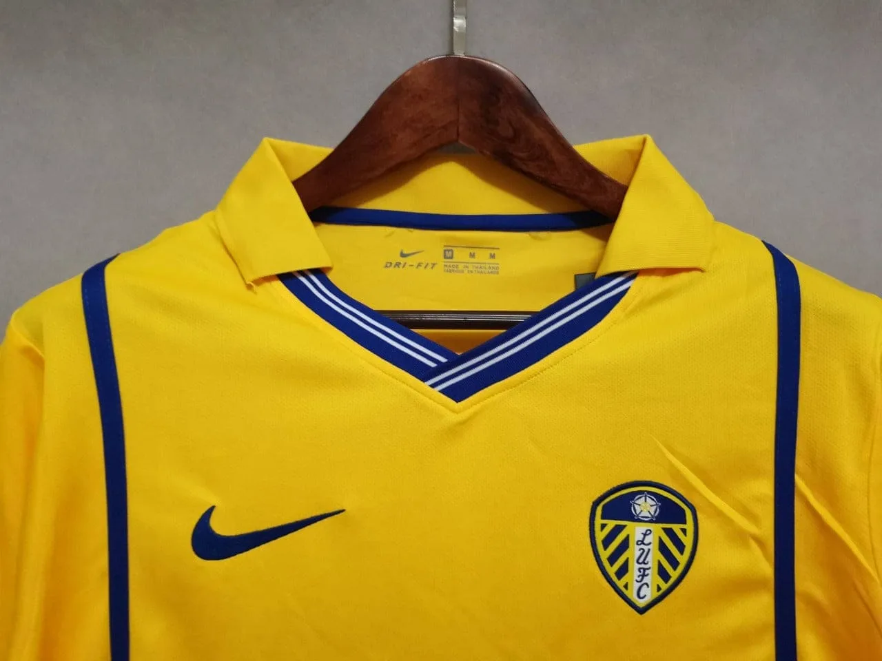 The Leeds United 2000/2001 home kit features a classic design with all-white shirt, shorts, and socks. The shirt has a round neck collar with blue and yellow trim, and blue and yellow stripes on the shoulders. The club crest is embroidered on the left chest with the sponsor’s logo printed in blue and yellow in the center. The shorts have blue and yellow stripes on the sides, while the socks have blue and yellow trim on the turnover cuff. This kit is considered a classic among Leeds United fans and is often associated with their success during the 2000-2001 season, when they reached the semi-finals of the Champions League.