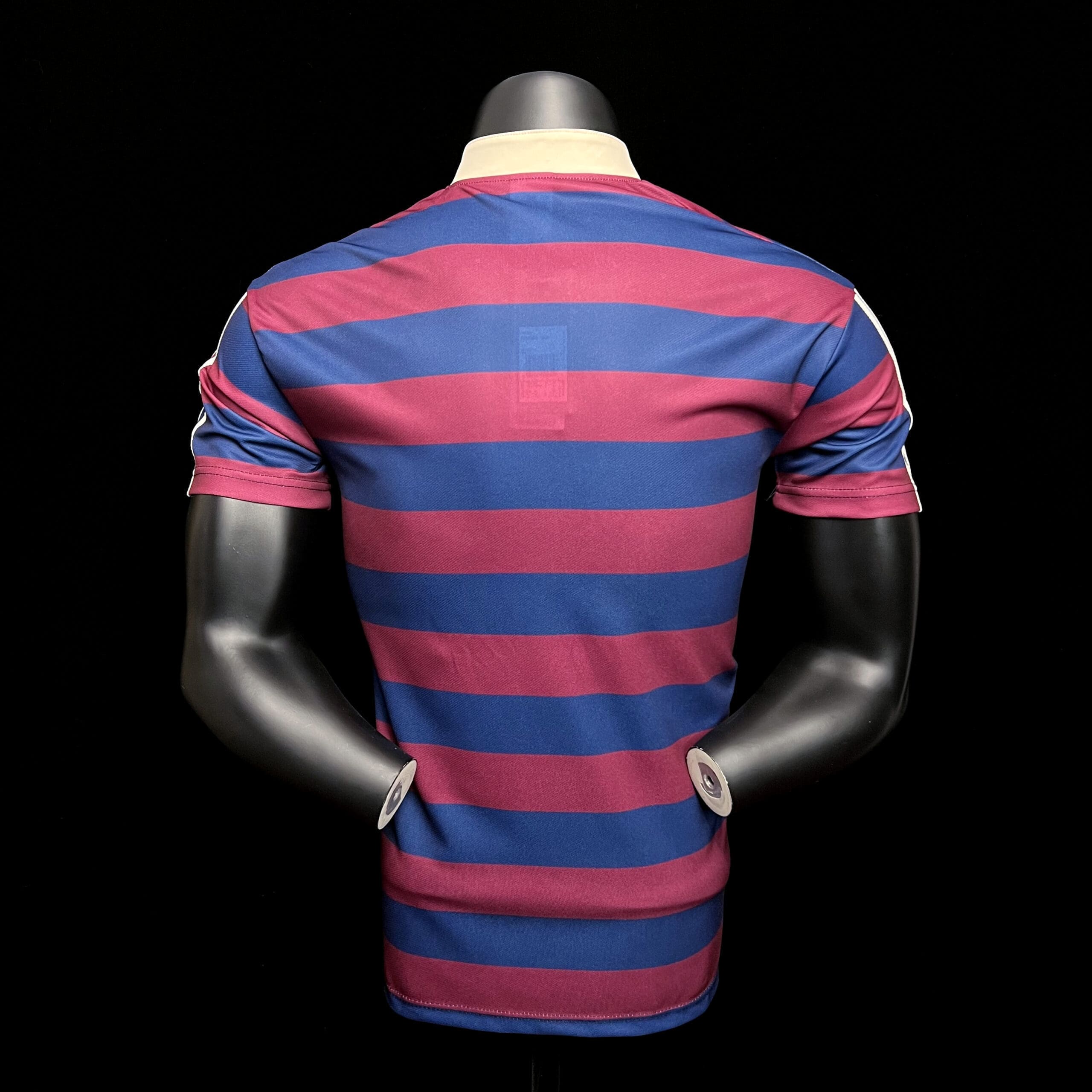 The **Newcastle United 1995-97 Away Retro Jersey** is an unforgettable design that stands out in the club’s history. This football jersey features a striking deep **navy and maroon hooped pattern**, a bold departure from the club’s traditional black and white stripes. The **Newcastle Brown Ale sponsor logo** takes center stage, adding a unique touch that fans still associate with this era.
