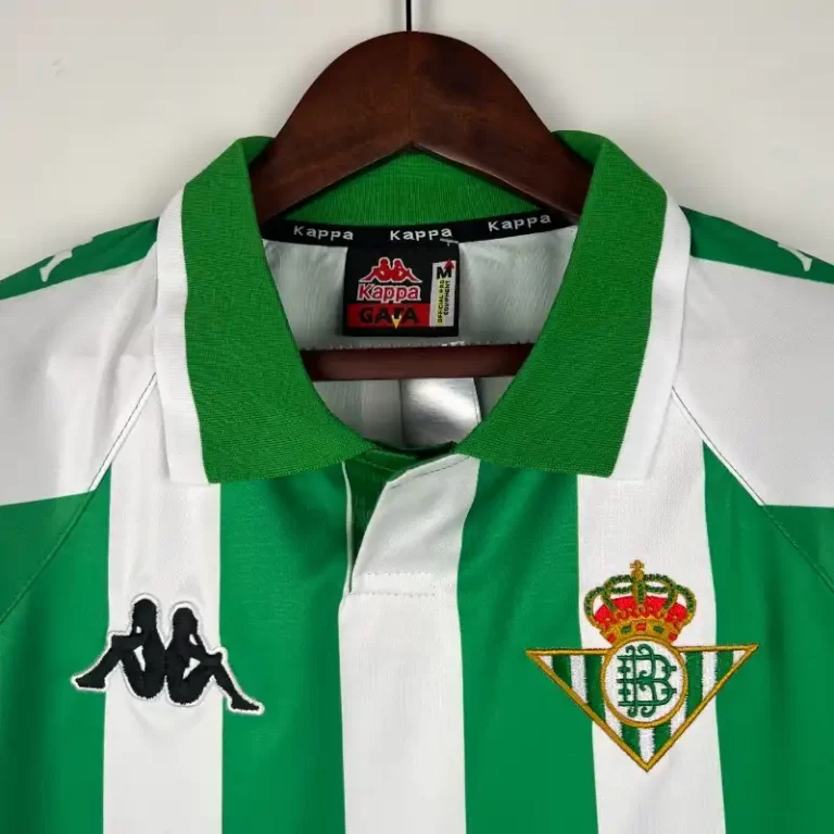 The Real Betis 2000-01 Home Kit is a nostalgic piece of football heritage that captures the essence of the club’s identity at the turn of the millennium. Featuring the iconic green and white stripes, this retro kit is a tribute to Betis’ proud history and rich tradition in Spanish football. The bold design, paired with a classic V-neck collar, offers a vintage jersey look that evokes memories of the memorable players who wore it during that time. A true classic jersey, this kit celebrates Real Betis’ legacy, making it a cherished piece for fans and collectors alike. Perfect for those who appreciate the timeless appeal of retro kits and want to remember a significant era in the club’s history.