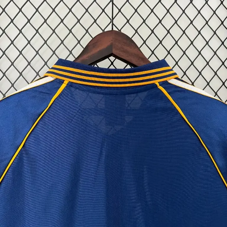 The Real Madrid 1998-2000 Third Kit is a nostalgic piece of football history, capturing the essence of one of the club’s golden eras. Featuring a bold navy blue base with striking white accents, this iconic kit stands out with its minimalist yet powerful design. The classic adidas logo and Real Madrid crest take center stage, evoking memories of the team’s dominance during this period.