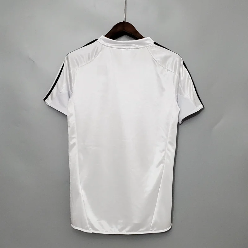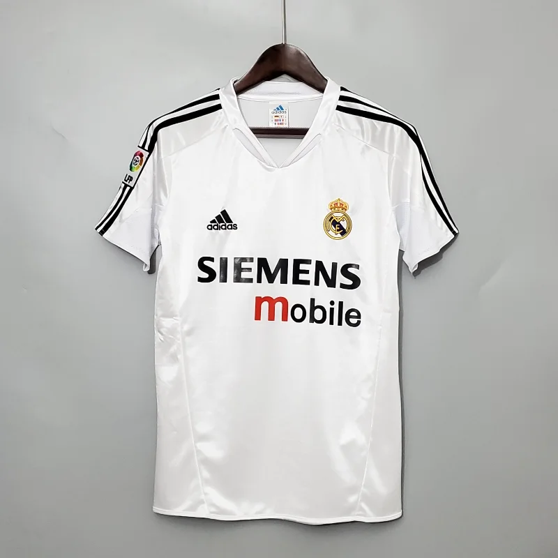 The Real Madrid 2004-05 Home Kit is a timeless piece of football heritage, showcasing the club’s commitment to excellence during a golden era. This classic jersey features the iconic all-white design with subtle accents that reflect the club’s tradition and prestige. With the distinctive “Santiago Bernabéu” embroidered badge, and the “Siemens Mobile” sponsor prominently displayed, this vintage jersey recalls a period filled with legendary players like Zinedine Zidane, Roberto Carlos, and Raúl. This retro kit perfectly embodies the essence of Real Madrid’s grandeur and their pursuit of glory on the pitch, making it a must-have for collectors and fans of classic kits. Whether worn on match day or as part of a nostalgic wardrobe, this home kit is a tribute to Real Madrid’s incredible footballing legacy and unforgettable moments.