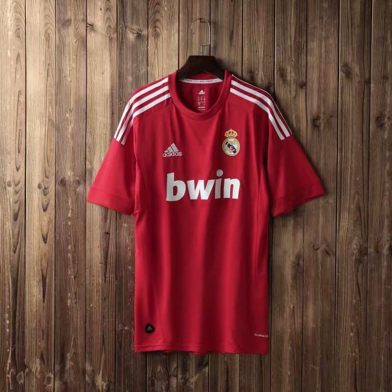 The Real Madrid 2013/2014 home kit with long sleeves is a classic white jersey with thin black stripes on the sleeves and a simple round neck collar. The iconic Real Madrid logo is proudly displayed on the left chest in full color, while the logo is on the right. The shirt features the Fly Emirates sponsor logo in the center of the shirt in blue, and there is a small blue logo on the back of the shirt just below the collar. The shirt is made from ‘ moisture-wicking ClimaCool fabric, designed to keep players dry and comfortable on the pitch. This kit has a retro feel to it and is considered a classic among Real Madrid fans.