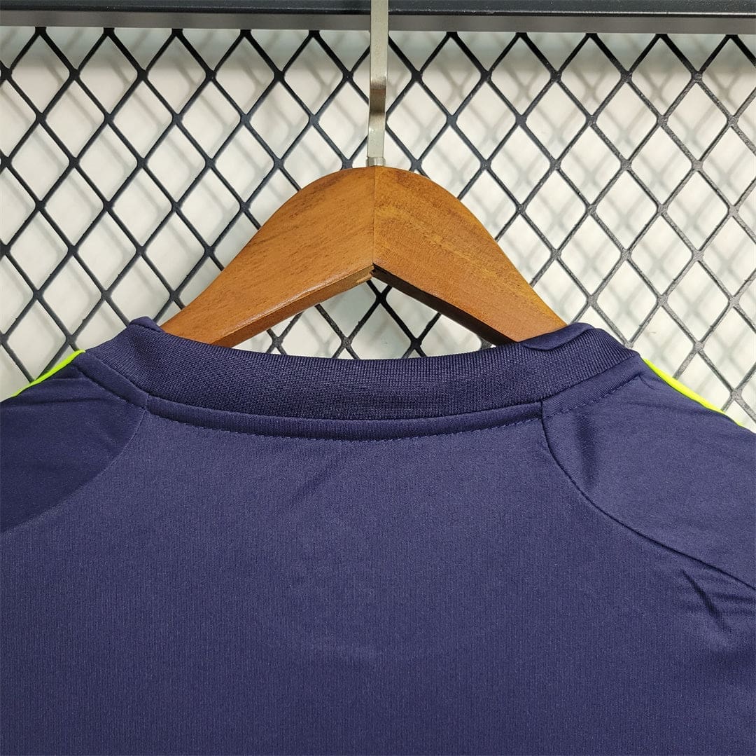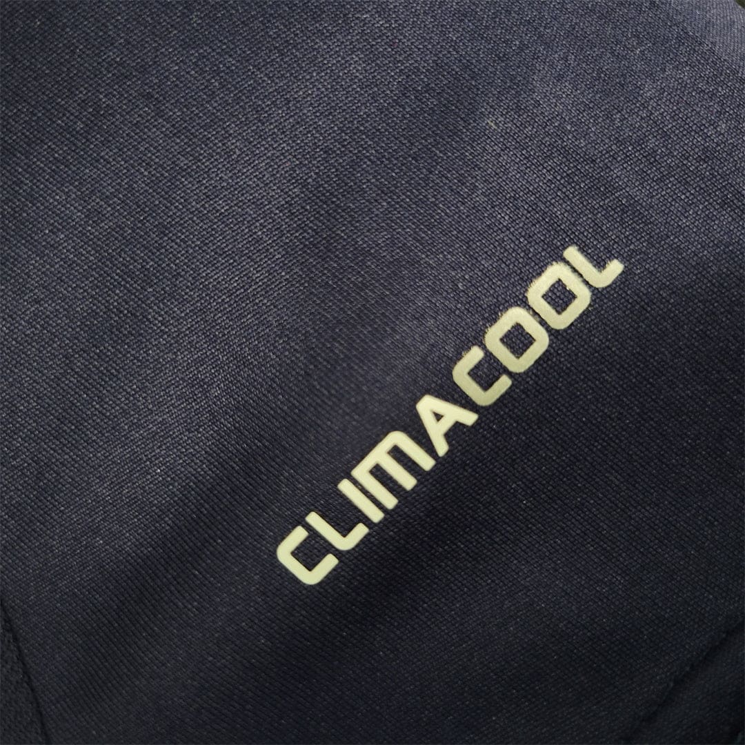 The Real Madrid 2012/13 Third green kit with long sleeves is a classic white jersey with thin black stripes on the sleeves and a simple round neck collar. The iconic Real Madrid logo is proudly displayed on the left chest in full color, while the logo is on the right. The shirt features the Fly Emirates sponsor logo in the center of the shirt in blue, and there is a small blue logo on the back of the shirt just below the collar. The shirt is made from ‘ moisture-wicking ClimaCool fabric, designed to keep players dry and comfortable on the pitch. This kit has a retro feel to it and is considered a classic among Real Madrid fans.