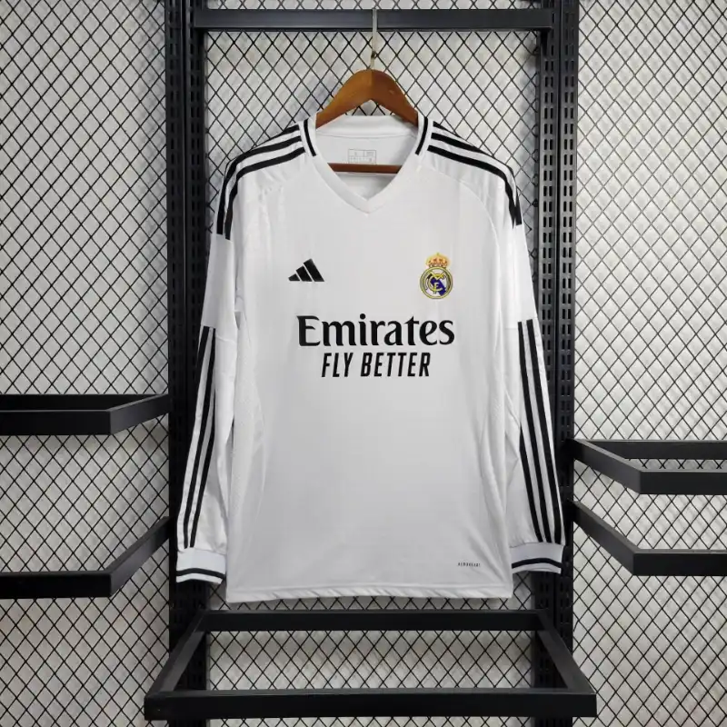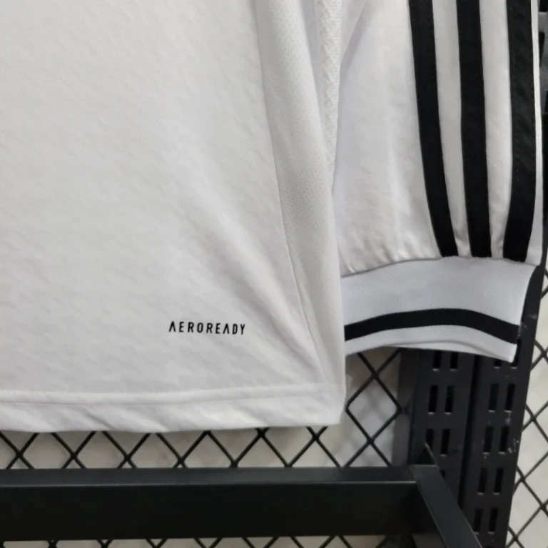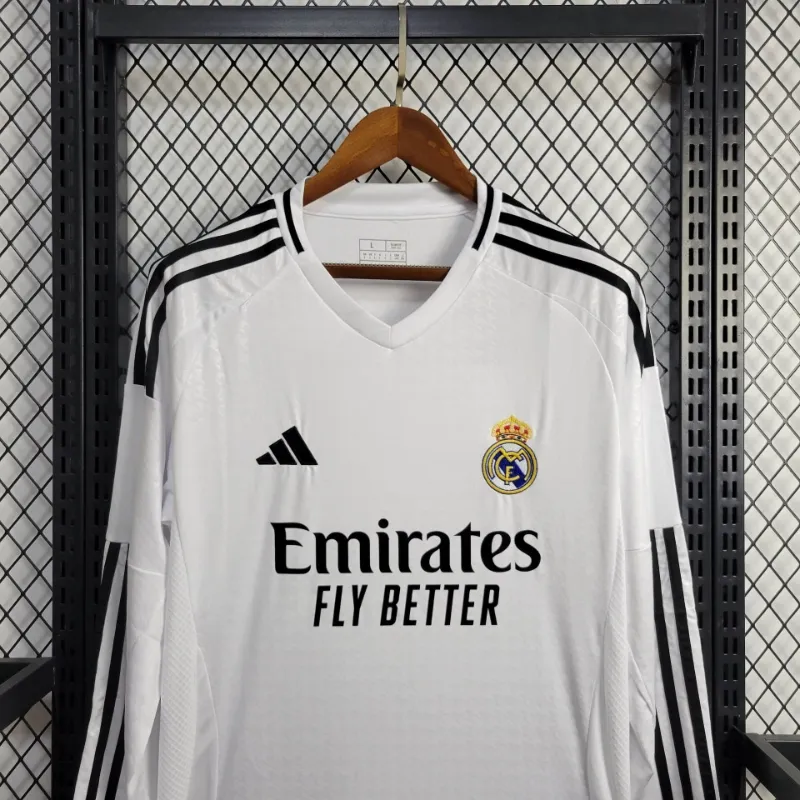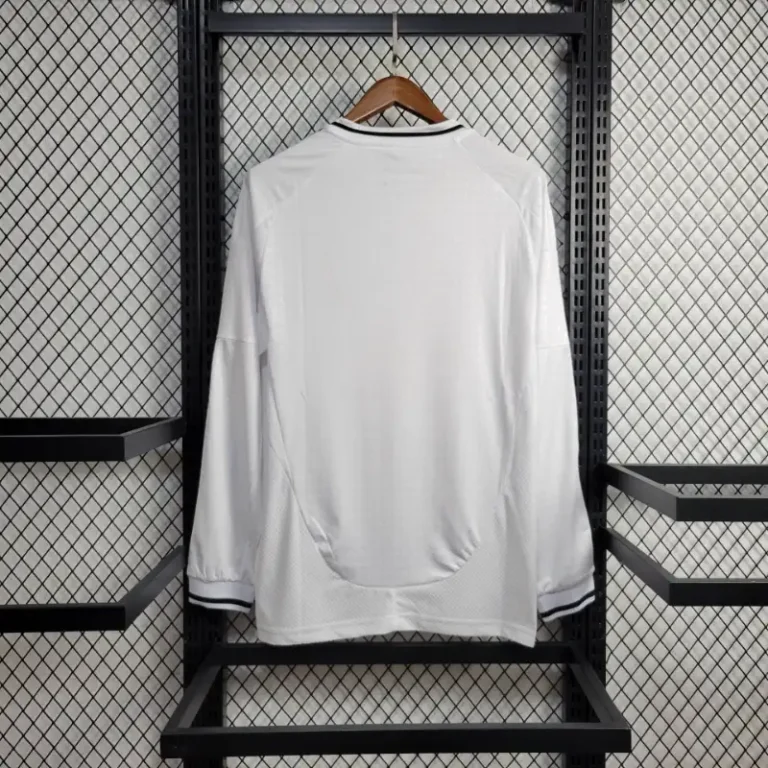 The Real Madrid 24/25 Home Kit – Long Sleeve – Fan Version is a brilliant homage to the club’s rich football heritage, blending modern design with the timeless elegance of classic jerseys. This retro kit showcases the iconic white base, accented by bold details that highlight Real Madrid’s distinguished legacy. The long-sleeve design offers a fresh take on the classic look, while still maintaining the vintage jersey feel that fans adore.