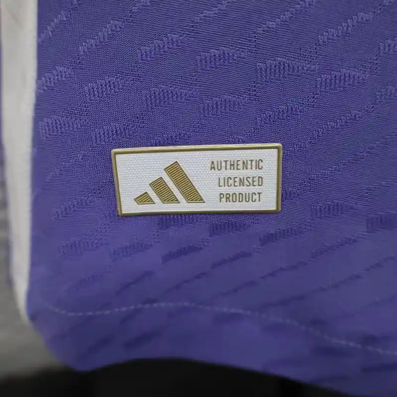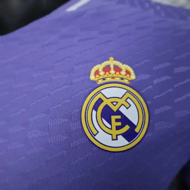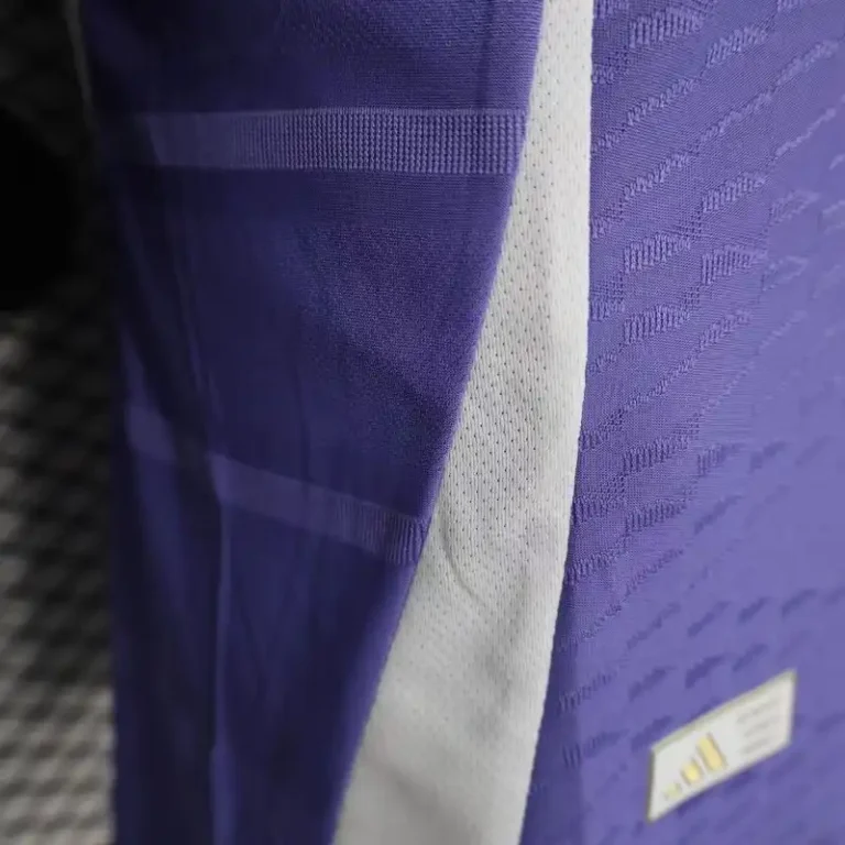The Real Madrid 24/25 Purple Away Kit – Player Version is a striking fusion of innovation and elegance. This kit features a captivating purple base, symbolizing the club’s regal history, complemented by subtle geometric patterns that add depth and texture.