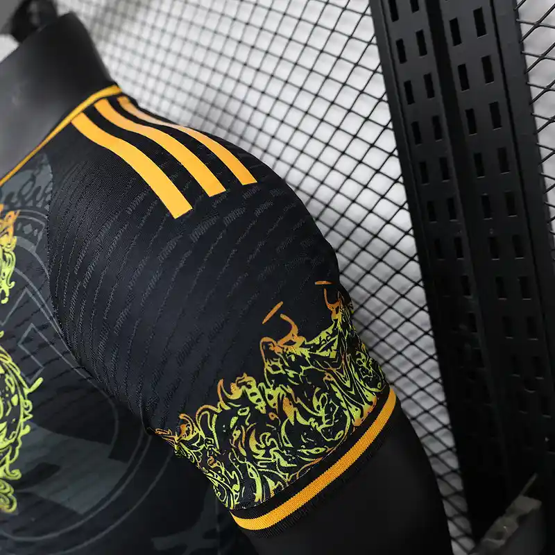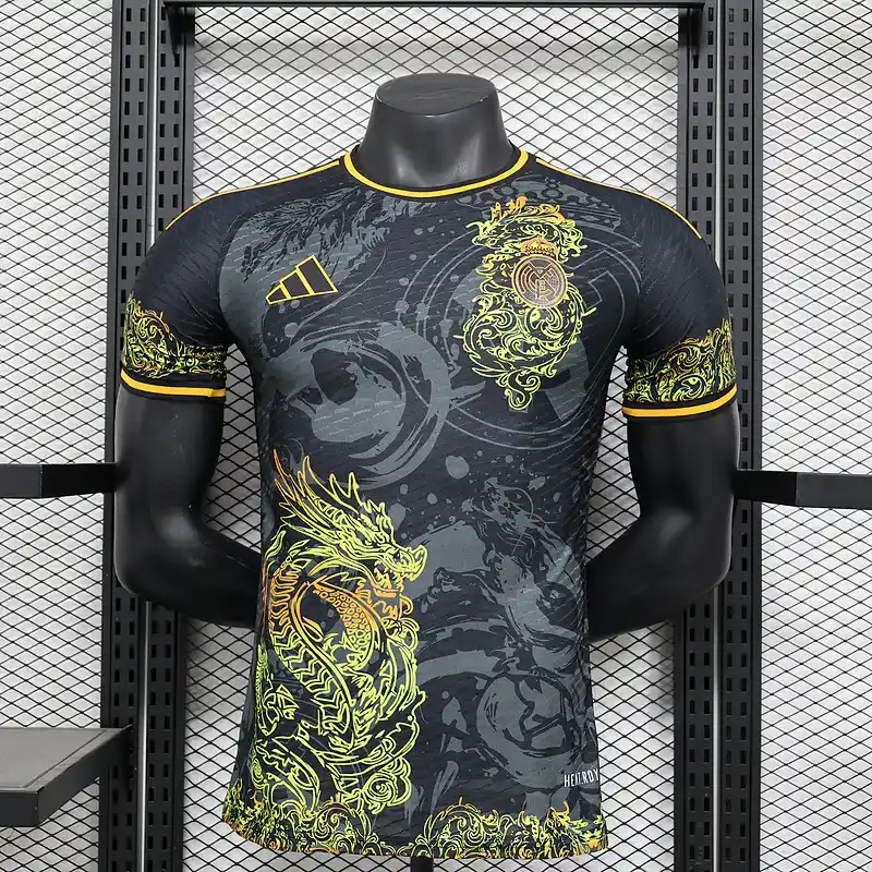 The Real Madrid Dragon Kit 24/25 – Player Version is a striking celebration of football heritage, seamlessly blending bold artistry with high-performance design. This classic jersey showcases a dynamic dragon motif, symbolizing strength and resilience, set against a sleek black base. Intricate gold and red accents elevate the look, offering a modern take on retro kit aesthetics that honor Real Madrid’s iconic legacy.