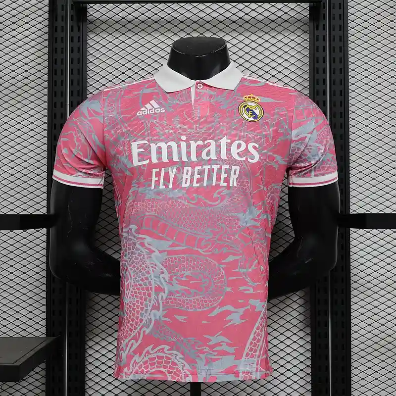The Real Madrid Pink Dragon Jersey 24/25 – Player Version is a bold testament to football heritage, combining modern style with a nod to retro kits. With its vibrant pink base and fierce dragon graphic, this vintage jersey channels strength and resilience, representing both the power of the club and the artistry behind its iconic legacy. The intricate details of the dragon motif, paired with the high-performance fabric, make this jersey a standout piece for fans and collectors alike.