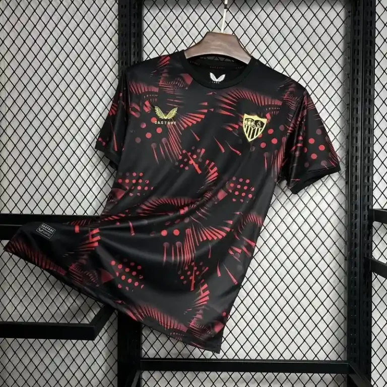 The kit features a rich combination of black and gold, providing a striking contrast that is both modern and timeless. With a design inspired by classic jerseys, it carries a sense of tradition while still embracing the bold, fresh aesthetic of today’s football fashion. The Sevilla crest on the chest proudly symbolizes the club’s historical achievements and relentless drive for success.