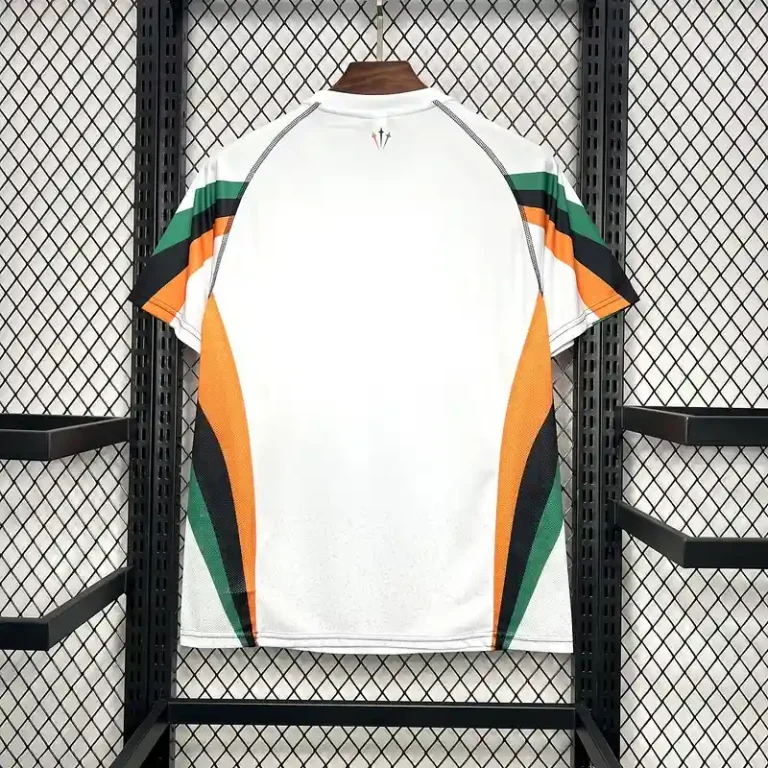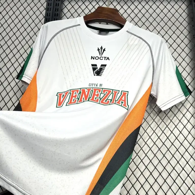 Draped in a clean, crisp white base, the kit is beautifully accented with green and orange detailing, reflecting the club’s iconic colors. The subtle yet striking design embodies the elegance of Venetian culture while maintaining a strong connection to vintage jerseys of the past.